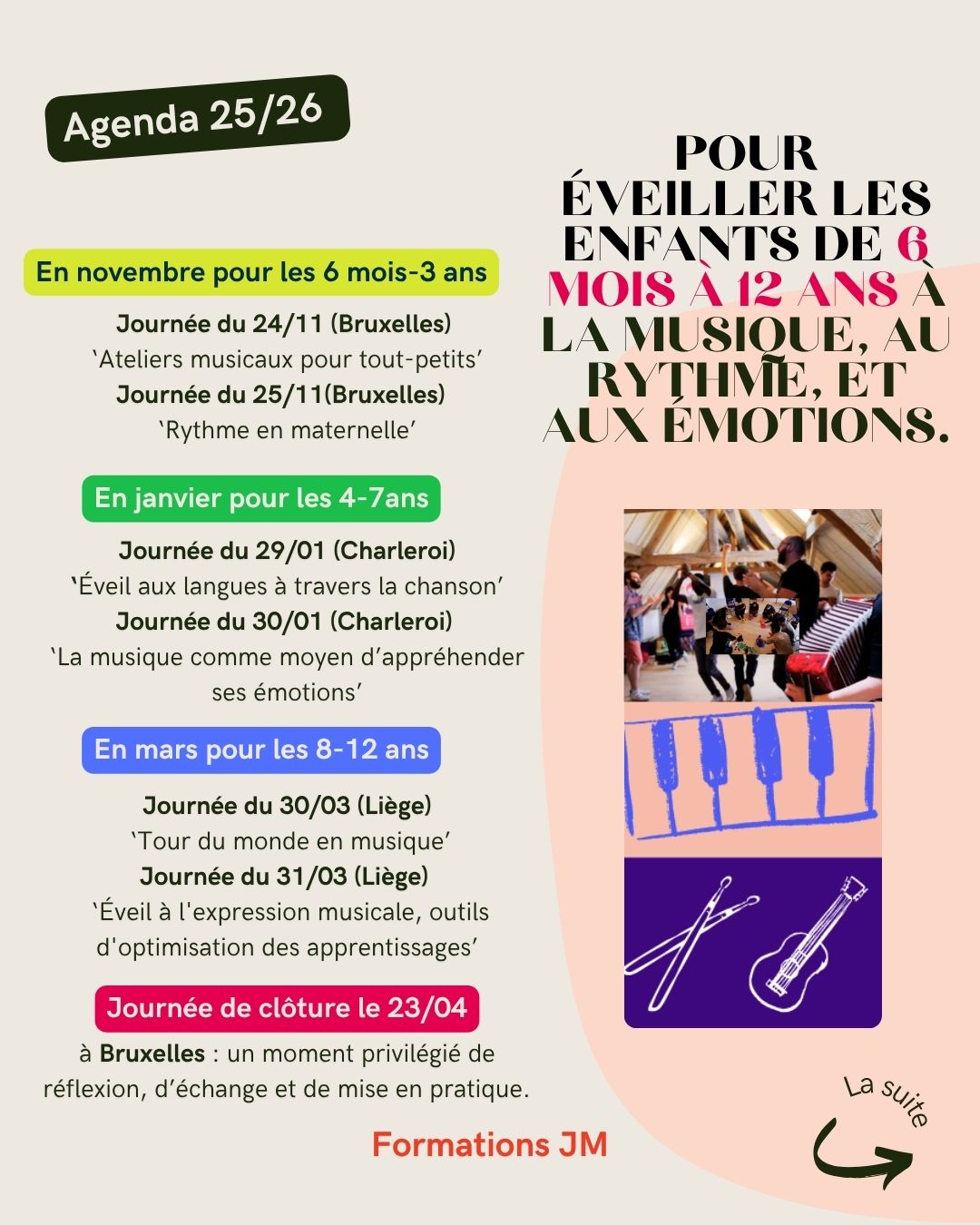 Vous travaillez avec des enfants âgés de 6 mois à 12 ans ou vous êtes musicien·nes et souhaitez créer ou enrichir vos ateliers musicaux en intégrant les principes du PECA (Parcours d’Éducation Culturelle et Artistique)? Rejoignez-nous pour nos journées de formation immersive à Bruxelles, Charleroi, Liège et Namur !